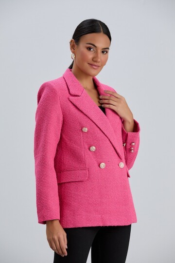 Önden düğme kapamalı, astarlı, süs cep detaylı, uzun kollu, kruvaze tüvit ceket