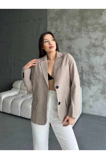 Kruvaze yaka, süs cep tasarımlı, önü düğme kapamalı, çizgi desenli ceket