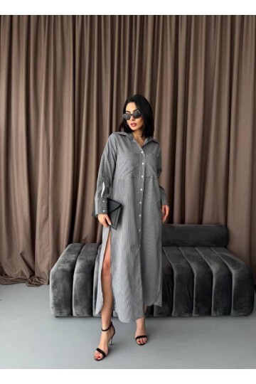 Cepli, gömlek yaka, önden düğme kapamalı,çizgili midi boy gömlek elbise