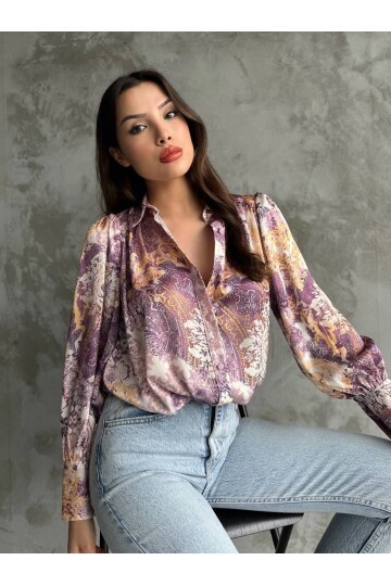 Önü düğme kapamalı, gömlek yaka, dökümlü, uzun kollu, desenli saten gömlek