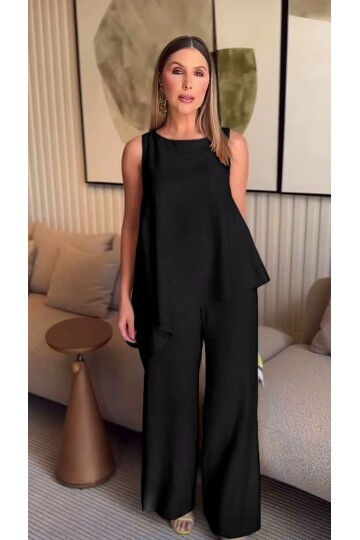 Asimetrik bluz, geniş paça, yüksek bel pantolon