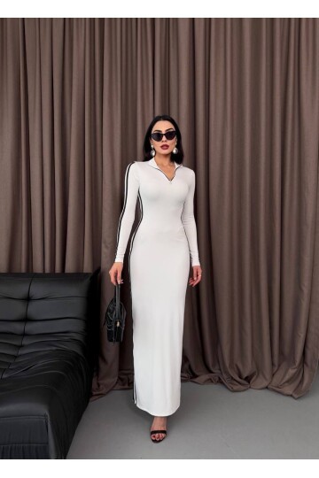 V yaka, uzun kollu, şerit detaylı arkası yırtmaçlı,uzun elbise